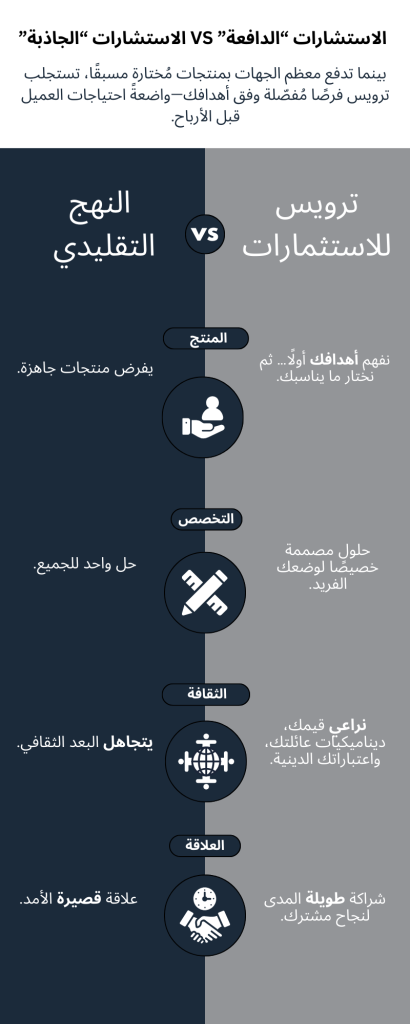 بينما تقوم معظم الشركات بـ “دفع” منتجات جاهزة ومحددة مسبقًا، تعمل ترويس للاستثمارات بمنهجية “الجذب”، حيث نقوم بتصميم فرص استثمارية مخصصة تتماشى مع أهدافك بدقة – واضعين احتياجات العميل قبل الأرباح. (انظر التوضيح أدناه)